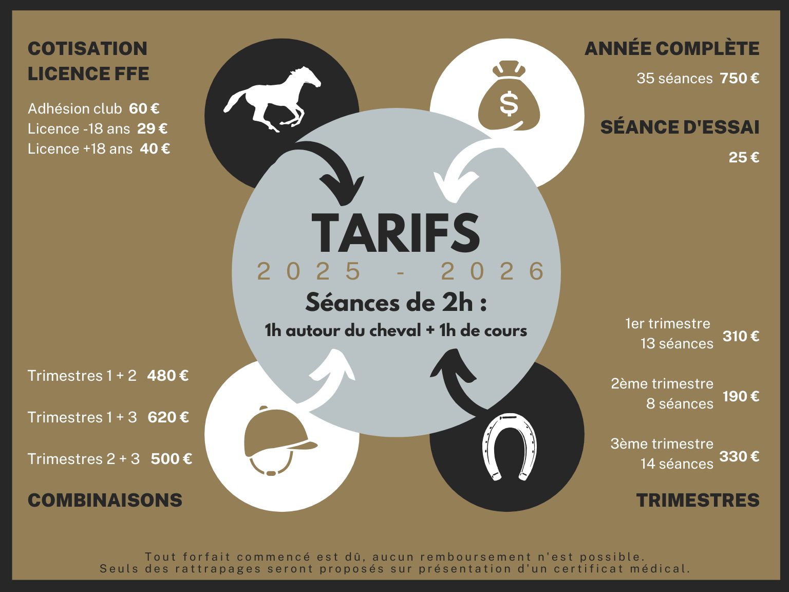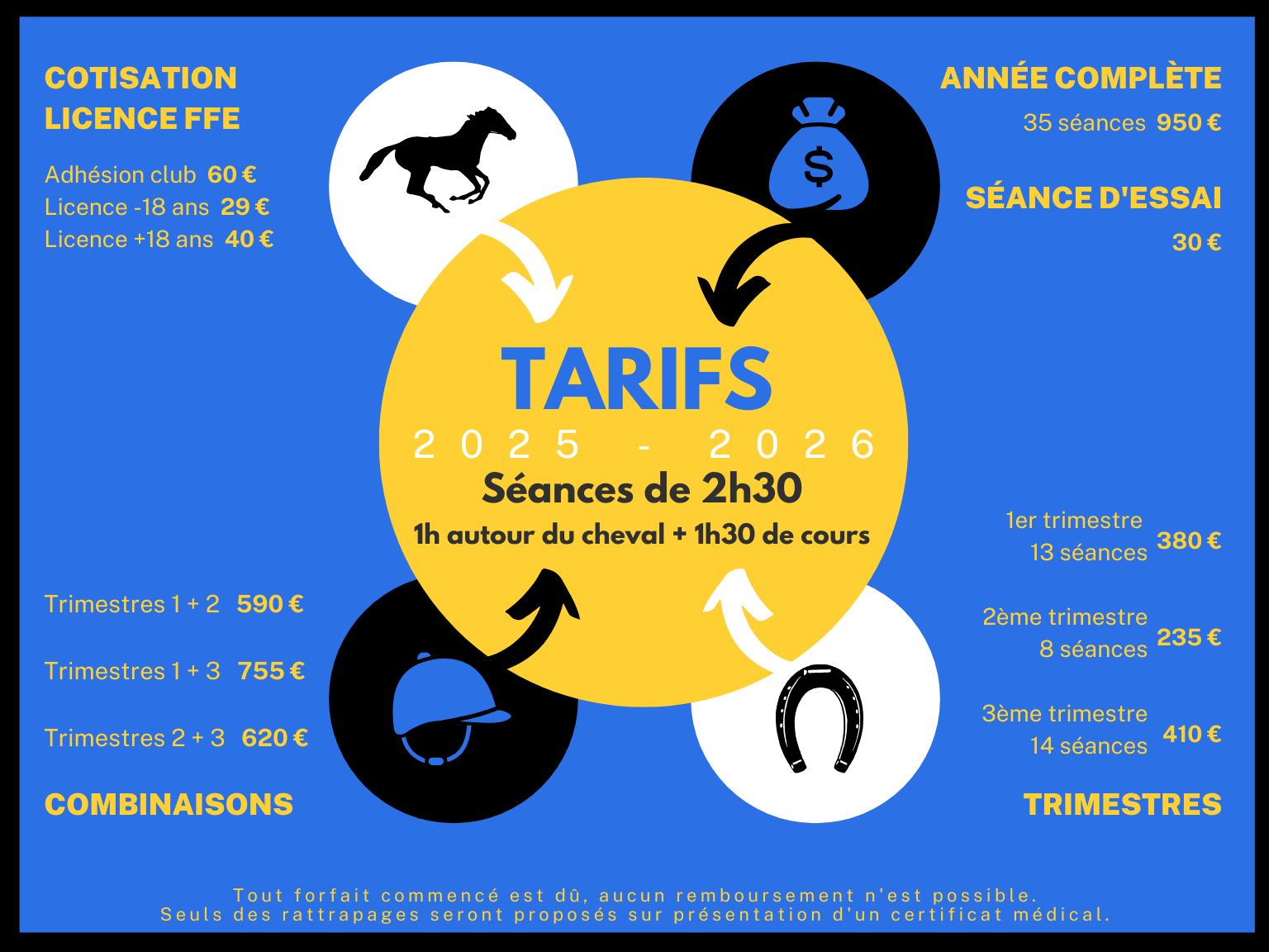 Pour toute inscription trimestrielle, l’adhésion au club et la licence FFE sont obligatoires